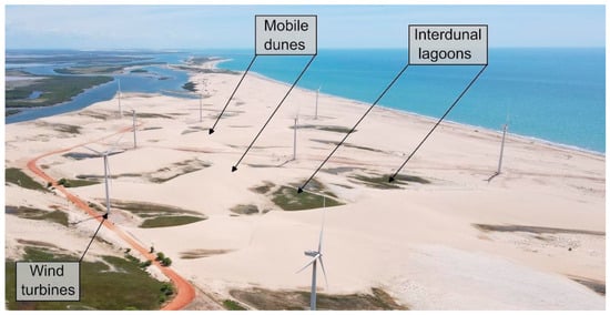 The Capim dunes geosite covers an area of approximately 0.7 km2 and is characterized by an extensive field of mobile dunes interspersed with interdunal lagoons, which are unable to retain water for extended periods, as well as the presence of wind turbines (Figure 14). The site derives its name from the low vegetation—grass—commonly found in the adjacent low-lying areas [36].