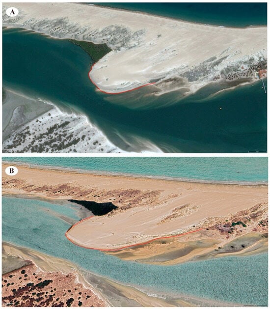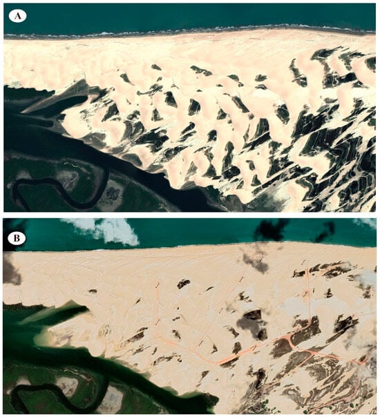 Evolution of the André dunes’ progression toward the tidal channel of the Galinhos–Guamaré estuarine system geosite in 2010 (A) and 2021 (B): the red line represents the front of the dune. Source: Google Earth.