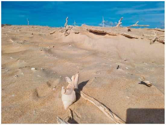 In contrast, the Capim dunes geosite is subject to more intensive anthropogenic disturbance, with tourism serving as the principal economic activity. The site hosts bivalve shells and Calotropis procera plant sub-fossils (Figure 23), commonly referred to as silk flower, silk rose, or beach cotton, among other names [51]. Despite limited accessibility and legal protection [33], extensive evidence points to significant human impact. The establishment of a wind farm in 2013 led to changes in local environmental dynamics (Figure 24). Over the subsequent decade, the interdunal lagoons that once characterized the site have disappeared, substantially diminishing its water retention capacity. Additionally, the geosite lacks effective access control and physical protection mechanisms, further exacerbating its vulnerability.
