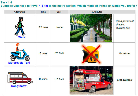 The alternatives are described by five key attributes: travel time, travel cost, and three qualitative factors reflecting walkability, safety, and comfort. For the walking alternative, these included pavement condition (smooth vs. uneven), availability of shading (e.g., trees or awnings), and the presence of obstacles (e.g., parked vehicles or street vendors). For the motorcycle taxi, a safety indicator was included to denote whether the passenger would be provided with a helmet. For Songthaews, the availability of a seat was included to capture comfort and service quality.