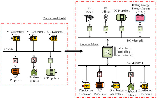 The development of the single-line diagram shown in Figure 1 is illustrated in the practical and theoretical requirements of next-generation shipboard power systems, particularly those transitioning toward hybrid AC/DC architectures. This transition is motivated by the need to increase energy efficiency, system reliability, and environmental sustainability onboard vessels that operate under varying electrical demands and constrained physical space. The proposed model adheres to the principles established in the maritime electrical architecture standards [21], which support the hybridization of AC and DC domains to accommodate diversified loads and DERs. The structure supports a future extension toward decentralized or hierarchical control, aligning with the trends in smart maritime electrification [22].