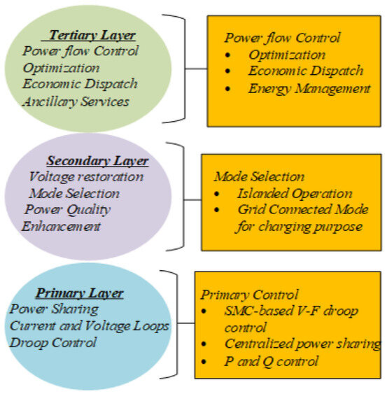 By combining AC and DC power grids, a microgrid can distribute power. Stable voltage and frequency are the primary functions of the microgrid’s control design. In conventional power systems, the current-controller-based proportional control designs were used to operate locally for every distributed interlinking converter, even though centralized control architectures are typically employed for primary controllers [10]. This decentralized droop controller provides smooth power flow and stability to the system. However, voltages and frequency variations due to grid transitions or dynamic load variations can cause system abnormalities. Therefore, a robust control strategy is required to overcome this issue [11].