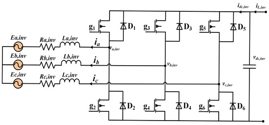 Figure 3 shows the three-phase VSC design for hybrid marine MG. The hierarchical control structure is managed by a two-level VSC device [35]. A voltage regulation controller is a key component of the main controller. Another option is to use the () to regulate the primary control layer. is the amount of current flowing across the filter capacitor, and is the current flowing through the other branches of the VSC. The inverter output voltage may be given using