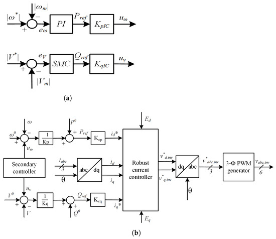 The current controller design. (a) SMC-based secondary controller design for frequency and voltage droops, (b) Primary current controller design.