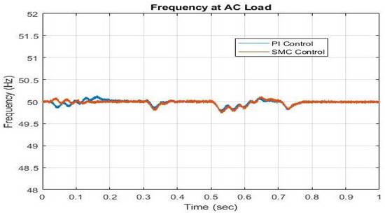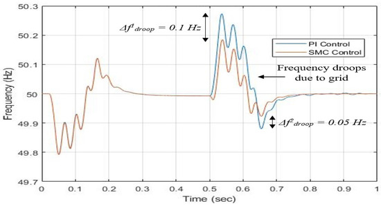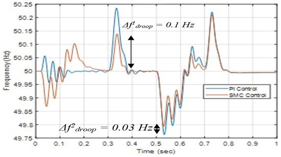 The steady-state condition is directly affected by the short-term operation of primary and secondary controls. In order to obtain reliable steady-state analysis in AC/DC microgrid modeling, it is necessary to have both the main and secondary controllers active. Hybrid SMG systems cannot operate without a reliable and appropriate method of power management, which allows for the regulation of load allocation among DC and AC power sources. Fewer attempts have been made in power management between AC and DC power generations for hybrid systems until now, while controlling power distribution in AC and DC microgrids. A reliable power-sharing method has been used to execute power-sharing control in microgrids. Multiple converters must work together to find the reference power that corresponds to the frequency droop characteristics [31,32].