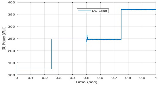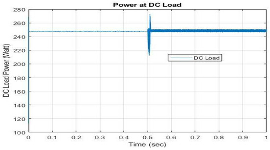 Figure 16 shows DC load waveform, which is regulated at W. Here, DC load is obtaining power from the AC source from s s. After that, it obtains power from the DC source, which is stable and the same. We also observed harmonics due to inverter switching in IC.