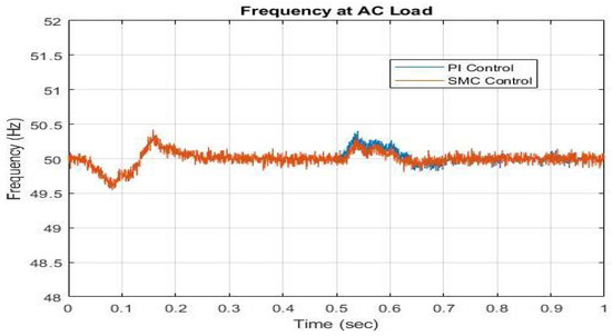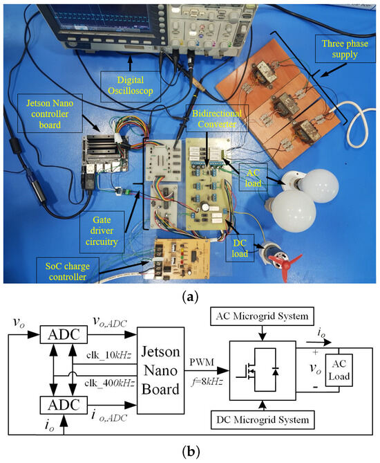 To quantitatively evaluate the real-time performance and robustness of the proposed control strategy, tracking error analysis was conducted during hardware experiments implemented on the NVIDIA Jetson Nano platform. Under step load variation scenarios where the system transitioned from 50% to 80% loading at t = 0.3 s and t = 0.7 s, the AC voltage and frequency maintained average steady-state tracking errors of less than 2.5%, as measured against their nominal reference values (230 V and 50 Hz, respectively). Similarly, the DC bus voltage deviation remained within 3%, even during simultaneous AC load fluctuations and renewable source variations. These values were determined through high-resolution oscilloscope data logging and real-time sampling at 10 kHz. The results confirm the robustness of the dual-layer PI–SMC controller in maintaining stability and control accuracy in the presence of dynamic disturbances and embedded execution constraints.