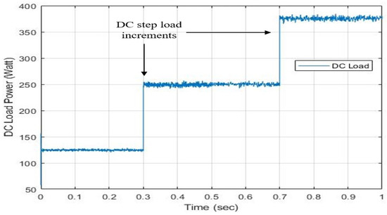 Figure 19 shows the DC load waveform which is regulated at W. The identical step DC load increased at s and s. After that, it obtains power from the AC source, which is stable and the same. We also observed harmonics due to inverter switching in IC.