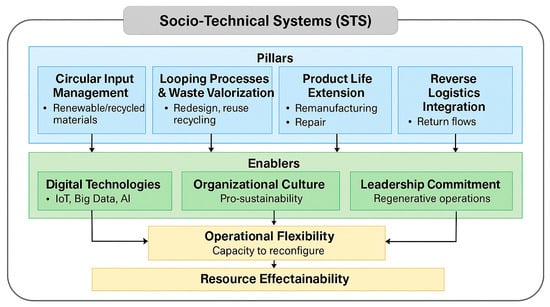 To move beyond fragmented initiatives, the field requires a comprehensive model that incorporates circular operations’ pillars, enabling technologies and conditions, and mediating organizational capabilities. This paper addresses this gap by developing an integrated conceptual model—grounded in socio-technical systems theory—that embeds circularity into the operational core of manufacturing, aligning internal processes with sustainability goals. The model is structured around four key pillars of circular operations: circular input management, looping process and waste valorization, product-life extension, and reverse logistics. These elements form the foundation for closed-loop performance within manufacturing systems.