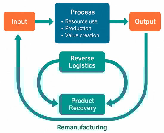 The manufacturing sector remains one of the largest contributors to global environmental degradation, consuming vast quantities of raw materials and generating significant greenhouse gas emissions [1,2]. The prevailing linear production model—characterized by the “take–make–dispose” paradigm—has proven unsustainable in the face of escalating ecological crises and increasing resource scarcity [3]. In this linear logic, products are designed for obsolescence, materials are discarded rather than reused, and value is extracted without regard for systemic consequences.