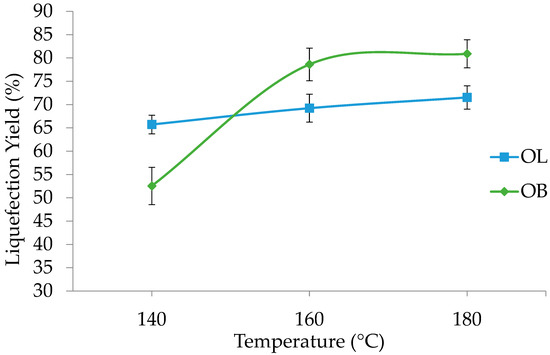 The results presented in Figure 1 indicate the effects of the temperature on the liquefaction percentages of the two olive tree byproducts, olive leaves (OL) and olive branches (OB). The data reveal a clear trend whereby increasing the temperature from 140 °C to 180 °C leads to higher liquefaction percentages for both materials. Similar results were presented before for different lignocellulosic materials, such as corncob [40], wheat straw [23], cork [16,41], or wood [42]. Nevertheless, in some cases, the liquefaction percentage decreases at higher temperatures due to condensation reactions, as, for example, in the liquefaction of Eucalyptus pellita [43] or cork [44].