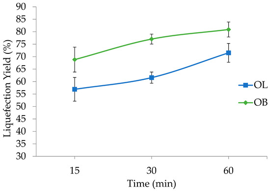 Liquefaction yield variation with time for olive leaves (OL) and branches (OB). Standard deviation in error bars.