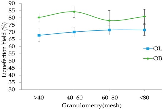 Liquefaction yield variation with particle granulometry for olive leaves (OL) and branches (OB). Standard deviation in error bars.