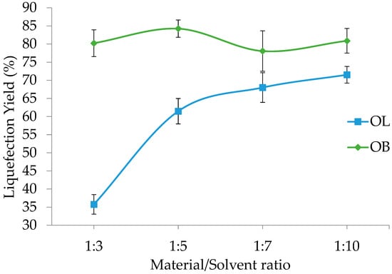 Liquefaction yield variation with material/solvent ratio for olive leaves (OL) and branches (OB). Standard deviation in error bars.