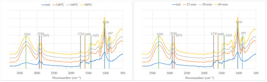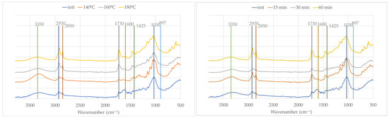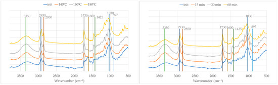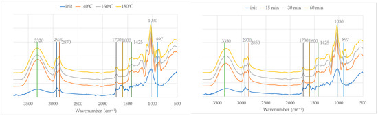 In Figure 6 (left), which illustrates the influence of the temperature after 60 min of reaction time, a progressive change in spectral features is observed with increasing temperatures (140 °C, 160 °C, and 180 °C). The broad O–H stretching band is centered around 3320 cm−1 for the liquefied material and 3350 cm−1 for the initial material and becomes significantly more intense in the liquefied material. This enhancement is attributed not only to the improved signal due to the liquid state but also to the cleavage of ether and ester bonds in the biomass matrix, leading to the release or formation of additional hydroxyl-containing species such as alcohols and polyols from glycerol and partially degraded lignocellulosic fragments.