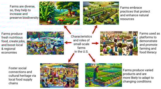 Agriculture-related industries contributed USD1.055 trillion of U.S. gross domestic product and created 19.7 million full- and part-time jobs in 2020 [12]. Small farms participate in the local food chains, contribute to local economies, get involved with the conservation of agricultural biodiversity, and maintain culturally important crops and landscapes [13,14]. They act as a link between the rural and urban centers through the movement of people and exchanges of food and money [15]. Thus, they create employment, reduce poverty, and improve food security [16], as shown in Figure 1. The negative environmental impacts, including animal welfare and food quality issues, associated with industrial agriculture are drawing consumers and retailers to small-scale producers either voluntarily or through legislation [17].