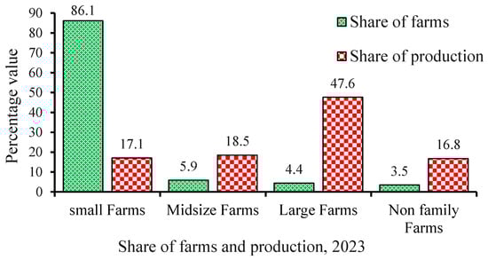 The U.S. Department of Agriculture [18] defines a “farm” as “any place from which USD1000 or more of agricultural products were produced and sold, or normally would have been sold, during a given year.” This definition includes entities that did not have at least USD1000 but would normally have. A farm-based point system developed by the USDA’s National Agricultural Statistics Service (NASS) determines when the USD1000 sales requirement is normally met. This system assigns dollar values for crops and livestock to estimate the level of sale. It also accounts for diminished sales due to harsh weather, disease, market strategy changes, and other factors. According to the 2022 Census of Agriculture, which is the most recent, more than 25% of farms have no sales in a typical year. They all belong to the small farms category. The USDA statistics show that the number of farms and the value of production are highly concentrated at opposite ends of the size scale (Figure 2). Smaller farms account for most farms, whereas larger operations account for most sales (Figure 2).