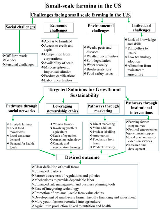 Small-scale farms deserve attention and support because they play crucial and important roles. Apart from ensuring provision of food security, they also provide other economic, environmental, and social–cultural benefits. In the United States of America, these farms are agriculturally, culturally, and geographically different. They have varied needs that trigger an array of distinct biophysical, socioeconomic, and institutional challenges. The effects of these challenges are exacerbated by economic uncertainty, technological advancements, climate change, and other environmental concerns. To provide ideal services to the small-scale farm audience, it is necessary to understand these challenges and opportunities that can be leveraged to enhance their productivity and profitability. This article reviews the challenges faced by small-scale farming in the United States of America. It then reviews possible pathways to enhance their productivity and profitability. The review revealed that U.S. small-scale farms face several challenges. They include accessing farmland, credit and capital, lack of knowledge and skills, and technology adoption. Others are difficulties to insure, competition from corporations, and environmental uncertainties associated with climate change. The paper then reviews key pathways to enhance small-scale farmers’ capacities and resilience with a positive impact on their productivity and profitability. They are enhanced cooperative extension services, incentivization, strategic marketing, annexing technology, and government support, among others. Based on the diversity of farms and their needs, responses should be targeted towards individual needs. Since small-scale farm products have an effect on human health and dietary patterns, strategies to increase productivity should be linked to nutrition and health.