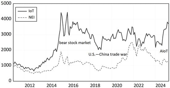 In 2015, international crude oil prices continued to decline, accelerating downward from July and hitting a new low of below USD 40 per barrel in September. The cost advantage of traditional energy became increasingly evident, severely undermining the market competitiveness of new energy sources. Consequently, market expectations for new energy demand cooled significantly. Meanwhile, from July to September 2015, China’s stock market experienced severe turbulence, prompting investors to withdraw capital from the new energy sector to avoid risk. This large-scale capital outflow left new energy enterprises facing financial constraints, as financing channels were obstructed, and investment projects were forced to scale down. These developments had a direct impact on the demand for IoT devices and solutions. Construction projects in the new energy sector, such as wind farms and solar photovoltaic (PV) power plants, rely heavily on IoT technologies to optimize energy production, reduce operational inefficiencies, and minimize environmental impacts. IoT sensors in wind farms monitor turbine status, wind speed, and wind direction in real time, facilitating optimization through smart control systems. Similarly, PV power plants use IoT technologies for remote monitoring and fault detection [57]. However, due to financial difficulties, many new energy companies postponed or canceled these smart infrastructure projects, resulting in a substantial reduction in IoT procurement orders. In addition, on the R&D front, new energy firms cut spending by suspending collaborative innovation projects with IoT companies, delaying the development of integrated low-carbon technologies. As a result, investments in exploring integrated applications of the IoT and new energy technologies were also curtailed, further shrinking the market space for IoT products and solutions. This contraction in both demand and innovation contributed to the decline in the IoT sector during that period.