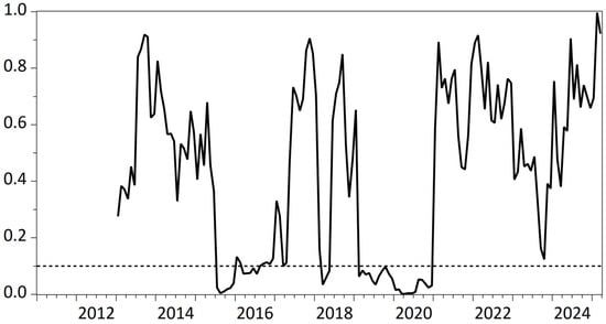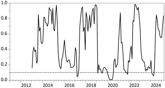 Table 4 presents the results of the Sup-F, Exp-F, and Ave-F tests, all of which reject the null hypothesis. This indicates that the VAR(s) system composed of the IoT and NEI exhibits significant structural parameter instability, with dynamic variations in their interrelationship over time. Additionally, the Lc statistic confirms the presence of non-stationarity within the parameters of the VAR(s) model. To further explore these dynamic linkages, this study employs a rolling window estimation approach. Using a fixed window length of 24 months, the Granger causality relationship between the IoT and NEI is tested in a sequential manner. Compared with full-sample analysis, this method allows for localized dynamic modeling, which better captures the time-varying characteristics of the causal interactions between variables. Over the sample period from January 2011 to March 2025, a total of 171 rolling sub-samples are generated. The results of the Granger causality tests for each sub-sample are visualized in Figure 2, Figure 3, Figure 4 and Figure 5. The findings reveal that both the direction and strength of the causal effect from the IoT to NEI (and vice versa) exhibit stage-specific fluctuations. By removing the confounding effects of structural breaks, this method uncovers the time-varying mechanisms that are obscured in traditional full-sample analyses, thereby offering more nuanced empirical evidence for dynamic policy evaluation.