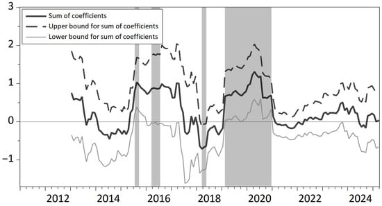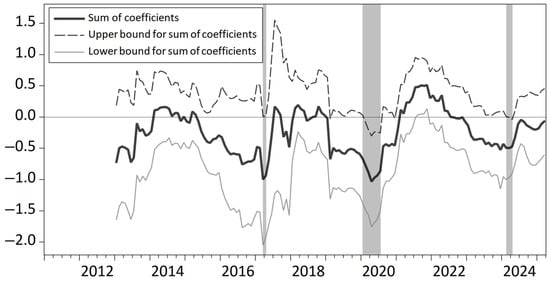 The p-values and estimated coefficients for the NEI and IoT are presented in Figure 4 and Figure 5. As shown in Figure 4, the null hypothesis that “NEI is not a Granger cause of IoT” is rejected at the 10% significance level during four specific periods: July to September 2015, March to July 2016, March to May 2018, and February 2019 to December 2020. According to Figure 5, the NEI exerted a negative influence on the IoT during the period from March to May 2018, while in the other three periods, the impact of the NEI on the IoT was positive.