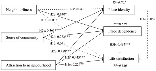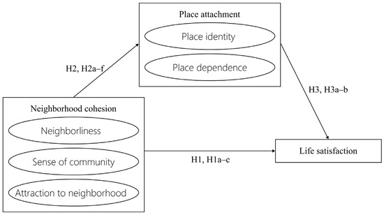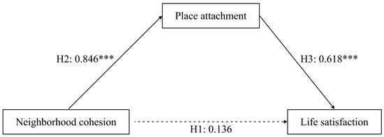 Place attachment is frequently studied as a mediator in research; for example, as a mediator in the relationship between urban green spaces and health [42], environmental stressors and happiness [43], local social identity and happiness [44], and national identity and tourist loyalty [45]. Place attachment is an emotional and functional connection between an individual and a specific environment. Research has shown that neighborhood social cohesion has a positive effect on place attachment [46]. Neighborhoods with strong social cohesion tend to provide more social support and positive interactions, which can enhance residents’ sense of identity and dependence on the community. Individuals are more bonded to their places of residence, where they can foster social bonds and collective ideals [47]. A more expansive social network inside the community can boost the sense of social cohesiveness within the neighborhood, which in turn promotes happiness and a sense of place-specific attachment [46]. It has been noted that neighborhood relationships, ownership status of the residential environment (community sense), and perceived community safety (neighborhood attractiveness) have a direct positive impact on place attachment [48]. The availability and attractiveness of community space are crucial for people to develop a sense of attachment [43]. Additionally, place attachment is empirically associated with health and well-being. Higher community attachment leads to better perceived happiness [49]. When residents feel more trust, respect, support, and satisfaction in their neighborhoods, they are more likely to develop an attachment to the community, and this sense of attachment can, in turn, improve their life satisfaction. In summary, this study proposes the following additional hypothesis: