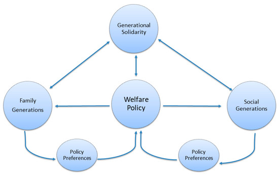 To understand how generational solidarity operates in shaping welfare attitudes, especially in aging societies, it is essential to distinguish between two analytically distinct but interrelated dimensions of generational relations: social generational relations and intra-family generational relations [5,7]. While the former refers to institutionalized policy cohorts—such as children, working-age adults, and the older adults—defined by their position within the welfare state architecture, the latter pertains to genealogical, lived relationships among family members who cohabit, care for, and support one another over the life course [8]. Social generational relations emerge from the way welfare states are structured to serve different age groups (see Figure 1). For instance, public pension systems are designed for older adults, childcare subsidies and education benefits are oriented toward younger cohorts, and unemployment insurance supports the working-age population. These cohort-specific allocations reflect not only administrative categorization but also social norms regarding entitlement and responsibility. Consequently, the way resources are distributed across these groups becomes a focal point for discussions of generational equity, often raising concerns about zero-sum trade-offs in an era of fiscal constraint and demographic change [9,10] (see Figure 1).