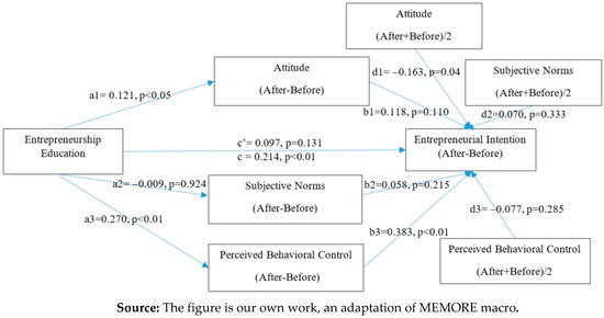 Figure 1 illustrates the statistical model for the effects (direct and indirect) of entrepreneurship education on entrepreneurial intention through the changes of the factors (of the theory of planned behavior). The results were exported using the MEMORE macro [30]. According to the following model, entrepreneurship education (x) causes a statistically significant total effect on (y), (entrepreneurial intention), (c = 0.214, p < 0.01) and a direct effect (c′ = 0.097, p = 0.131). According to the above, the total effect matches the paired samples t-test. According to MEMORE, entrepreneurial intention (after–before) is used as the difference scores, and X (predictor) is constant (entrepreneurship education) for all the components. If the predictor does not change, then the total effect is the mean difference, which is precisely what the paired t-test captures.