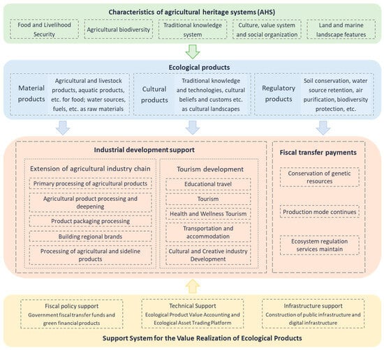 The value realization of ecological products is an important part of rural and agricultural development. As a significant force for protecting traditional agricultural systems and promoting rural revitalization, agricultural heritage systems (AHSs) have formed diverse value realization paths of ecological products in the process of dynamic protection and adaptive management. Through theoretical research, this article analyzed the characteristics of ecological products in AHS sites (EPAHSSs) and summarized the framework of value realization paths of EPAHSSs. Then, the Wannian Rice Culture System in China was selected as a case for conducting empirical research. The results showed that EPAHSSs exhibit obvious uniqueness in terms of climate environment, germplasm resources, farming and breeding models, and cultural heritage. The value realization paths of EPAHSSs mainly include industrial development support, such as the extension of agricultural industrial chains and the development of tourism, as well as fiscal transfer payments. The case analysis results indicated that Wannian County contains a rich variety of ecological products and developed a value realization pathway mainly based on the integration of industries and supplemented by fiscal transfer payments during the process of protection and development. However, further optimization is needed to promote the development of tourism and other paths. This study not only contributes to the sustainable development of the Wannian Rice Culture System, but the proposed framework is also applicable to other heritage systems and similar regions.