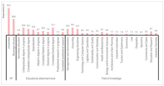 Respondents’ Profile. Source: Prepared by the authors. Legend: Management and Administration (Administration, Business Management, Financial Management, Healthcare Management, Market Planning), Accounting (Controllership, Forensic Accounting), Engineering (Electrical Engineering, Civil Engineering, Mechanical Engineering, Production Engineering, Chemical Engineering, Materials Engineering, Food Engineering, Control and Automation Engineering, Environmental Engineering, Forestry Engineering, Process Engineering), Technology and IT (Information Technology, Computer Science, Systems Analyst, Informatics, Industrial Mechatronics), Logistics and Operations (Logistics, Logistics Technology, Machine Operation, Production Assistant, Production Supervisor, Paper Industry), Sustainability and Quality (Environmental Management, Quality Control, Packaging Specialist, International Relations, Local Development, Sustainable Management and Innovation), Communication and Marketing (Advertising and Marketing, Social Communication and Journalism, Press Relations, Graphic Design, Product Design), Health and Biosciences (Nursing, Pharmacy, Veterinary Medicine, Biomedicine, Psychology, Physiotherapy, Nutrition, Nutritionist, Healthcare Management), Biology and Environmental Sciences (Biology, Environmental Sciences, Environmental Monitoring, Oceanography, Genomics and Biotechnology), Tourism and Gastronomy (Tourism, Events and Gastronomy, Dairy Science, Nutrition and Environmental Quality, Animal Science-Quality), Agronomy and Agricultural Sciences (Agronomy, Forestry Engineering, Veterinary Medicine, Animal Science), Education and Research (Pedagogy, Literature, Education, Teaching, Anthropology, Mathematics), Industrial Chemistry (Chemistry, Chemical Engineering, Pharmaceutical Sciences, Clinical Pathology, Immunology).
