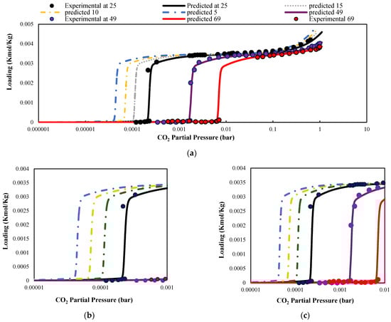 (a) 1 × 10 −6 to 10 bar, (b) 1 × 10 −5 to 1 × 10 −3 bar, and (c) 1 × 10 −5 to 1 × 10 −2 bar. Curves correspond to temperatures of 69 °C (red), 49 °C (purple), 25 °C (black), and model predictions at 15 °C (green), 10 °C (yellow), and 5 °C (blue). Circle markers represent experimental data.