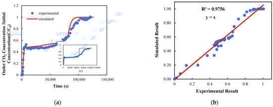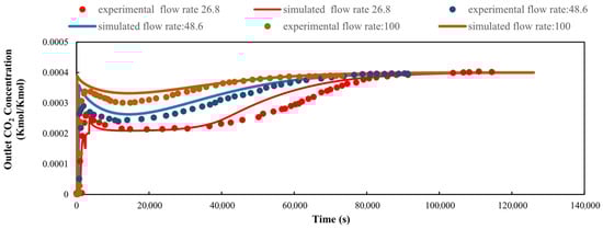 To achieve accurate modelling of breakthrough dynamics, the reliability of the isotherm model was first established. Figure 2a–c demonstrate the close alignment between simulated and experimental CO2 adsorption isotherms at 25, 49, and 69 °C, which are shown in different ranges of CO2 partial pressure. The model also reproduced the adsorption behaviour trend at lower temperatures, supporting its suitability for DAC simulations under reduced temperature conditions. The validated isotherm model was utilised to simulate breakthrough performance, which was subsequently compared with experimental data. Figure 3a presents the breakthrough curves at 23 °C and a flow rate of 17.2 N mL/min. Quantitatively, the predicted breakthrough time deviated by about 3% (Figure 3b), underscoring the model’s predictive accuracy. Further validation at different inlet flow rates (Figure 4) demonstrated the model’s robustness across varying operational conditions. For flow rates of 26.8, 48.6, and 100 NmL/min, the average absolute relative deviation (AARD) values were 8.18%, 7.24%, and 4.97%, the root mean squared error (RMSE) values were 2.99 × 10−5, 3.10 × 10−5, and 2.88 × 10−5, and the R2 values were 0.81, 0.72, and 0.80, respectively.