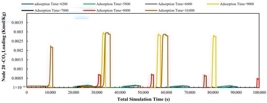 CO2 loading at the bed outlet (node 20) as a function of total simulation time (adsorption + desorption), extending until equilibrium is reached. Each curve corresponds to a different adsorption duration: 5800 s (green), 6200 s (dark blue), 6600 s (purple), 7000 s (black), 8000 s (red), 9000 s (yellow), and 10,000 s (brown).