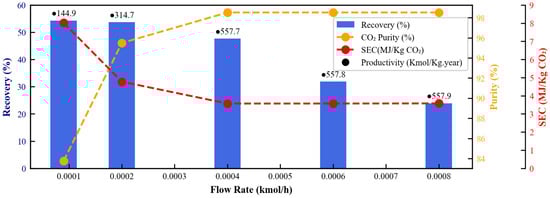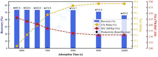 Effect of adsorption time on process performance indicators. The column plot represents recovery (%), with numerical values above each column indicating productivity (kmol CO2/Kg·year). The two dashed lines correspond to CO2 purity (%; yellow) and specific energy consumption (MJ/Kg CO2; red).