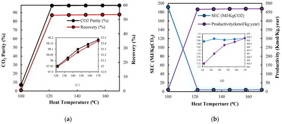 Effect of different heating temperatures during the desorption stage on performance indicators. Panels (a,b) show temperature ranges from 100 to 170 °C, while panels (c,d) zoom in on the range of 120–170 °C, with axis titles consistent with the main figures. (a) CO2 purity (%) and recovery (%) are represented by black and red lines, respectively. (b) Productivity (Kmol CO2/Kg·year) and specific energy consumption (MJ/Kg CO2) are shown by purple and blue lines, respectively.