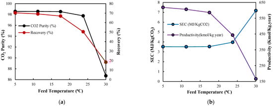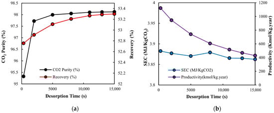 Effect of desorption time on performance indicators over the range of 300 to 1500 s. (a) CO2 purity (%) and recovery (%) are shown by black and red lines, respectively. (b) Productivity (Kmol CO2/Kg·year) and specific energy consumption (MJ/Kg CO2) are shown by purple and blue lines, respectively.