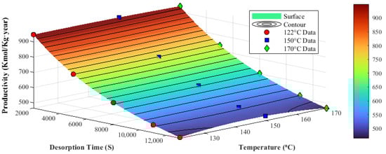 Figure 8a,b illustrate the variation in productivity, CO2 purity, recovery, and specific energy consumption across different desorption durations under a constant evacuation pressure (Peva = 0.09). Extending the desorption time beyond 500 s had minimal impact on specific energy consumption (which remained nearly constant) and CO2 recovery (which stabilised around 52.8–53.2%) since the bed reached its target temperature early in the desorption stage, and both metrics subsequently stabilised. However, desorption time showed a more significant influence on CO2 purity and overall process productivity. Increasing the duration up to 2000 s improved purity, as more CO2 was removed from the bed. Beyond this point, further improvement in purity was negligible (<0.2%), indicating that the sorbent’s desorption capacity was nearly exhausted at 120 °C. Meanwhile, longer desorption times reduced the number of process cycles that could be completed annually, thereby decreasing overall productivity. Previous studies have demonstrated that an optimal desorption duration exists that maximises CO2 yield with minimal energy input []. Similarly, findings from multi-objective optimisations of TVSA cycles using amine-functionalised solid sorbents showed that prolonged desorption offers diminishing returns in terms of purity and recovery, while significantly reducing productivity due to extended cycle times []. Moreover, Figure 9 shows the variation in productivity with desorption temperatures between 120 and 170 °C across desorption durations ranging from 2000 to 12000 s. The curve indicates that the desorption temperature exceeded the identified threshold (~120 °C), making the desorption duration increasingly influential. In this regime, rather than further increasing the temperature, reducing the desorption time becomes a more effective strategy for improving annual productivity without compromising separation performance.