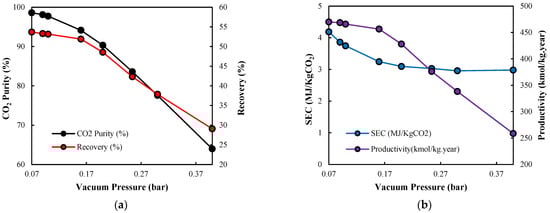 In a TVSA process, regeneration of the adsorbent is achieved by applying both elevated temperature and reduced pressure, which together enhance the thermodynamic driving force for CO2 desorption [,,]. Therefore, the selection and optimisation of desorption temperature and vacuum pressure are closely interdependent.