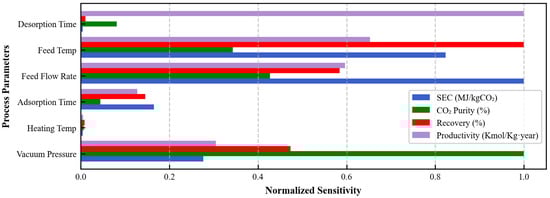 However, this extended adsorption period introduces a trade-off. While longer adsorption times improved bed utilisation and allowed the bed to approach full saturation, they also coincided with the plateau region of the breakthrough curve, where the adsorbent was no longer able to capture all incoming CO2. Consequently, CO2 recovery slightly decreased by approximately 2%. As shown in Figure 6, increasing the adsorption time enhanced specific energy consumption and CO2 purity, with both metrics plateauing around 9000 s, signifying that the system approached equilibrium and the adsorption bed was saturated with CO2 (Figure 5). Meanwhile, beyond 9000 s, process productivity declined, as fewer operational cycles could be completed annually. This reflects a performance limitation—while prolonging the adsorption phase initially improved overall performance, it eventually led to diminishing returns in both productivity and CO2 recovery.
