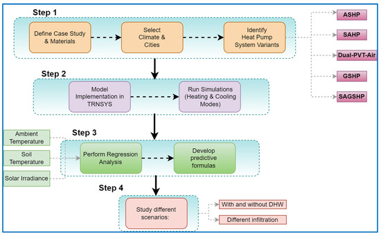 As a result, this study is conducted through numerical simulations to evaluate the performance of different heat pump configurations across various climatic conditions. The methodology of this work is presented visually in Figure 1.