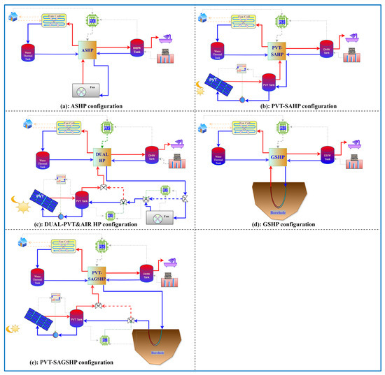 Various heat pump configurations can be designed by integrating different energy sources to enhance efficiency and adaptability. This study examines multiple configurations, including Air-Source Heat Pumps (ASHP), Photovoltaic–Thermal Solar-Assisted Heat Pump (PVT-SAHP), Ground-Source Heat Pumps (GSHP), Photovoltaic–Thermal Solar-Assisted Heat Pump, Solar-Assisted Ground-Source Heat Pumps (PVT-SAGSHP), and Dual-Source Photovoltaic–Thermal and Air (DUAL-PVT-AIR), each leveraging different renewable energy sources to optimize performance across diverse climatic conditions, as shown in Figure 2.