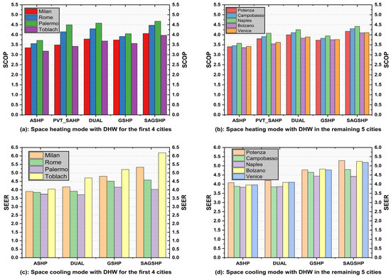 In space heating mode, the results show that PVT-SAGSHP consistently achieves the highest SCOP, reaching 4.06 in Milan, 4.47 in Rome, and 4.68 in Palermo, while ASHP has the lowest in all cities, around 3.35 in Milan and 3.56 in Rome. Warmer climates improve solar-assisted systems’ efficiency due to higher irradiation, while GSHP performs better in colder regions, benefiting from stable ground temperatures. For instance, the SCOP of DUAL-PVT-AIR in Palermo is 4.59, but for GSHP it is 4.05. However, for Toblach, which has a cold climate, they have the same performance: the SCOP for DUAL-PVT-AIR and GSHP are 3.69 and 3.57, respectively.