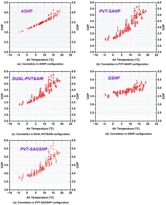 The regression equations presented below form the foundation of the simplified performance model, expressing the relationship between system efficiency (COP and EER) and key environmental parameters such as air temperature, solar irradiance, and soil temperature. Each configuration reflects different levels of sensitivity to these variables, depending on the energy sources involved. While the equations are mathematically straightforward for expert readers, their statistical robustness and practical implications are further clarified through detailed analysis in Section 4.2.1 and Section 4.2.2. Moreover, Table 4 provides an overview of the regression results, including R2 values and p-values for each variable, confirming the reliability and statistical significance of the models.