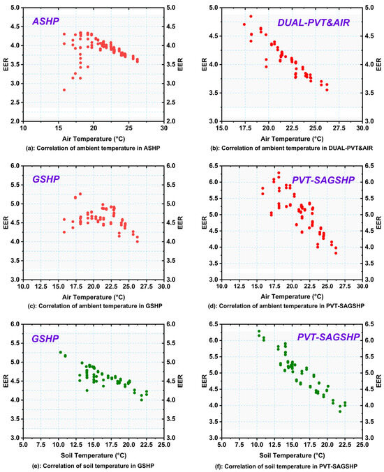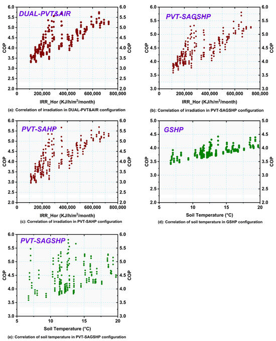 The correlations between ambient temperature and COPs are shown in Figure 4 for space heating mode, and the correlation between soil temperature/irradiation and COP is presented in Figure 5. By increasing the ambient temperature, soil temperature, and irradiation, the COP for all configurations increases, and for space cooling, as ambient temperature or soil temperature increases, the EER decreases, as presented in Figure 6. Since in space cooling mode the solar radiation is used only for DHW production, its correlation with EER is not presented.