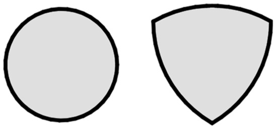 A comparison of cross-sections: on the left, a circular section; on the right, a Reuleaux triangle section. Both shapes have the same reference area.