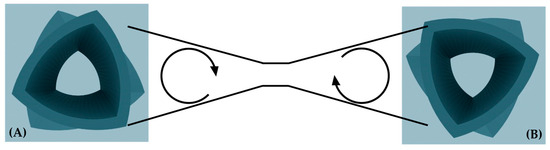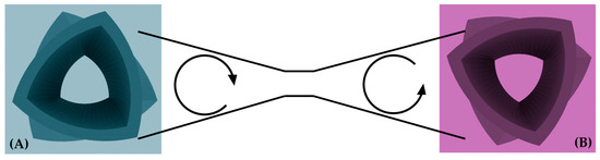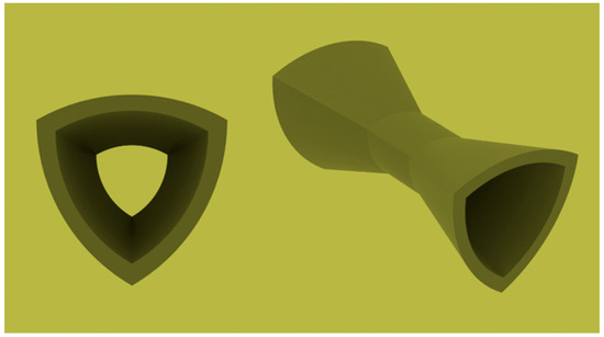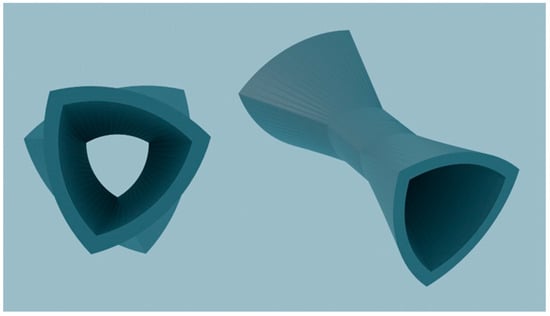 To further enhance cavitation intensity, the use of helical variants is hypothesized, involving axial twisting of the triangular conduit section. The Reuleaux triangle was chosen specifically for its constant width, allowing axial twisting without altering the internal channel profile. This feature enables controlled and uniform flow rotation (swirl), a fundamental condition for developing VRAt configurations [21].