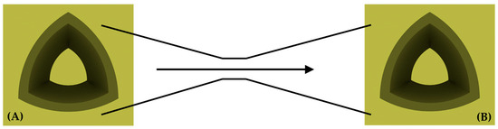 Each of the three cusps of the Reuleaux triangle features an internal angle of 120°. Due to the presence of pronounced cusps, this shape has a significantly greater perimeter compared to a circular section of equal area, resulting in a substantial increase in the perimeter-to-area ratio (P/A). This particular configuration, characterized by sharply defined cusps, leads to a markedly higher perimeter than that of an equivalent-area circular section, thereby generating a notable increase in the P/A ratio. As a result, the density and uniformity of cavitation microbubble nucleation sites are enhanced, significantly improving the efficiency of the process [19,20].