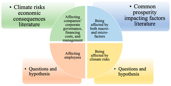 Furthermore, past studies found that climate risks will affect companies in several ways, such as bank loan pricing [6], corporate social responsibility [7], the firm’s values [8], the firm’s leverage ratios [9], the sustainable development performance of companies [9] and annual reports’ readability [10]. Climate risk is the risk posed by climate change and extreme weather events [11,12]. Climate risks can be broadly categorized into physical and transition risks [12,13] (for a detailed definition and measurement of climate risks, see Section 3.2.2). There has been a lack of attention in the past literature on the impact of climate risks on firms’ employees. As one of the corporate stakeholders, employees may also be affected by climate risks. In addition, the literature on factors affecting common prosperity reveals that past studies focused more on the analysis of macro-level factors and measuring the common prosperity more in terms of the share of labor income. There are relatively few studies on micro-level factors and measuring the common prosperity of corporate employees from a multidimensional perspective. For example, Lyu et al. (2025) found that digital capability impacts common prosperity in a significantly positive way [14]. The study of Li et al. (2025) shows that employee stock ownership plans (ESOPs) can improve common prosperity proxied by the labor income share within the enterprise [15]. However, the process of realizing common prosperity is not exactly the same for people in different fields. And the realization of common prosperity not only includes income but also the standard of living of the people (see the link for more details: https://www.gov.cn/zhengce/2015-12/07/content_5020963.htm (accessed on 22 April 2025)). Therefore, it is of great significance to study the common prosperity of people in different fields and measure it in a multidimensional way.