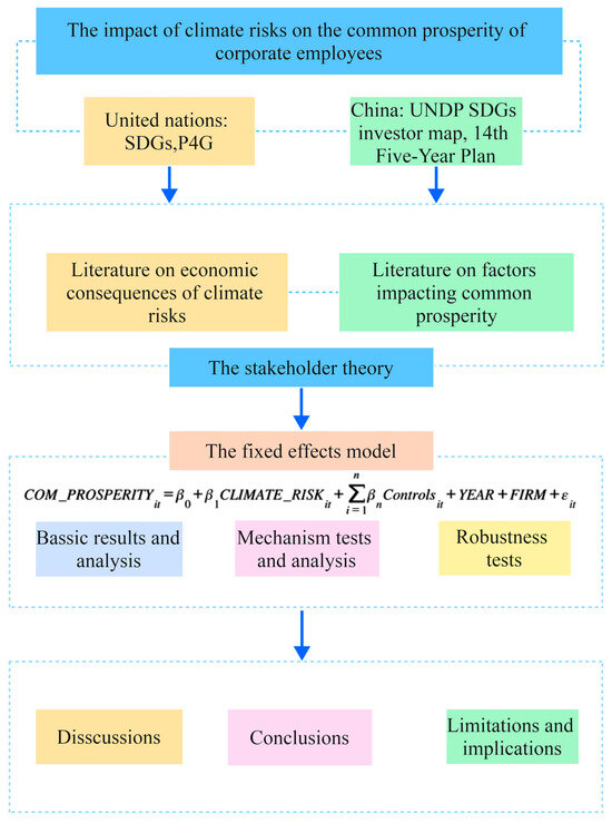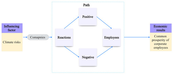 This study is based on stakeholder theory. Ansoff, who first introduced the term “stakeholders” into management and economics, stated that the stakeholders of a corporation may be managers, workers, shareholders, suppliers, and distributors [52]. It is considered that Freeman (2010) first established the stakeholder theory (this book was first published in 1984) [53]. He pointed out that stakeholders include individuals and groups. These individuals and groups can influence the achievement of organizational objectives or be affected by the process of achieving those objectives. Moreover, employees, as an essential part of the corporation, are one of the key stakeholders in the corporation. Climate risks‘ impacts on corporations inevitably spill over to corporate employees. The research framework of this study is shown in Figure 2.