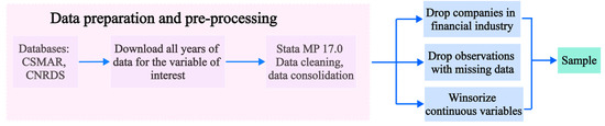 In this study, the data are processed as follows: (1) exclude the data of enterprises in the financial industry; (2) exclude the firms with missing data for the main variables; and (3) winsorize the upper and lower 1% for continuous variables. Data are processed using Stata MP 17.0. The data processing process is presented in Figure 4. Finally, this study obtained a total of 25,822 sample observations.